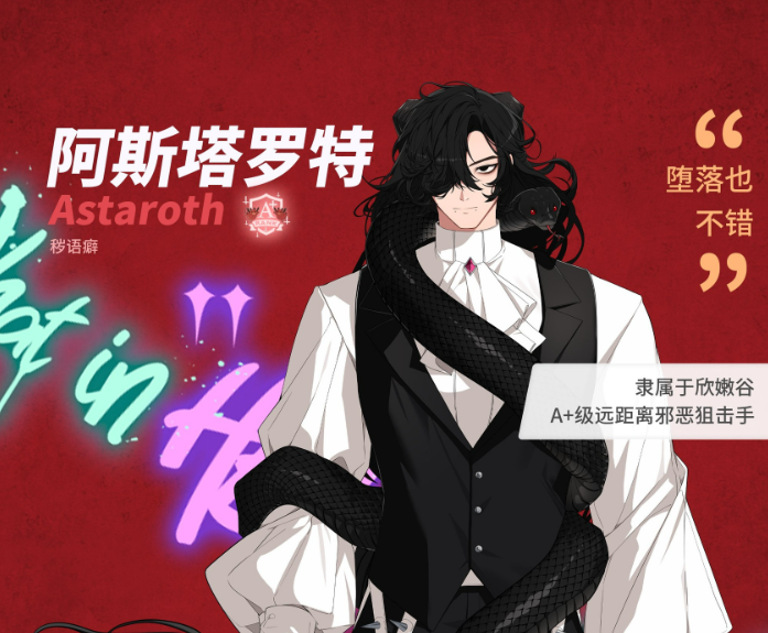隶属于以撒旦为王的〈欣嫩谷〉的A+级恶魔一位召唤他的魔法师说他的嗓音就像一颗沉甸甸的黑珍珠在天鹅绒 上滚动,光是听着他的声音就会感到心醉神迷。他具有让已经堕落的恶魔再次堕落的绝对而颓废的喜好。