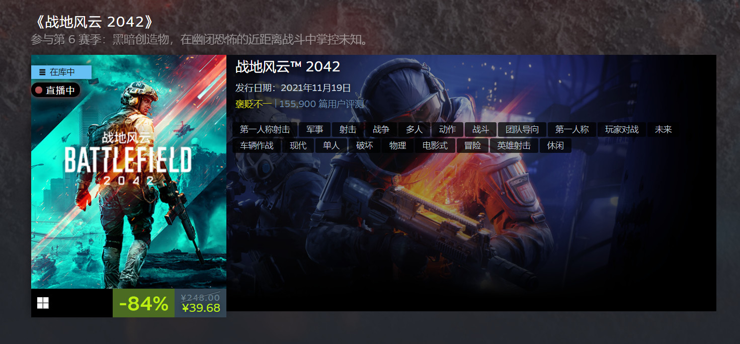 《战地2042》:原价248元,现价39.68元,降价84%