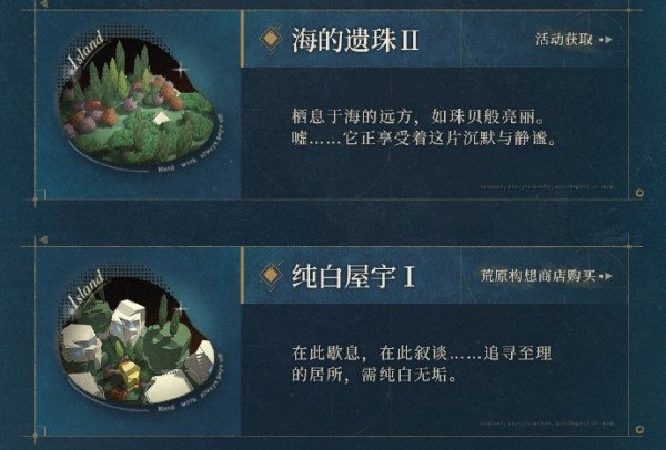 3、海的遗珠II、纯白屋宇II、遗落海岸II以及先哲雕像I部分需要玩家完成任务获得。