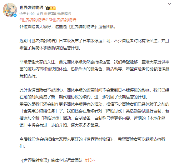 非常感谢大家的关注,首先简体字版仍然会持续运营,我们希望能够一直给大家提供丰富的游戏内容和愉快的体验,包括后面的新角色、新活动等,希望冒险者们能够继续游玩和支持。