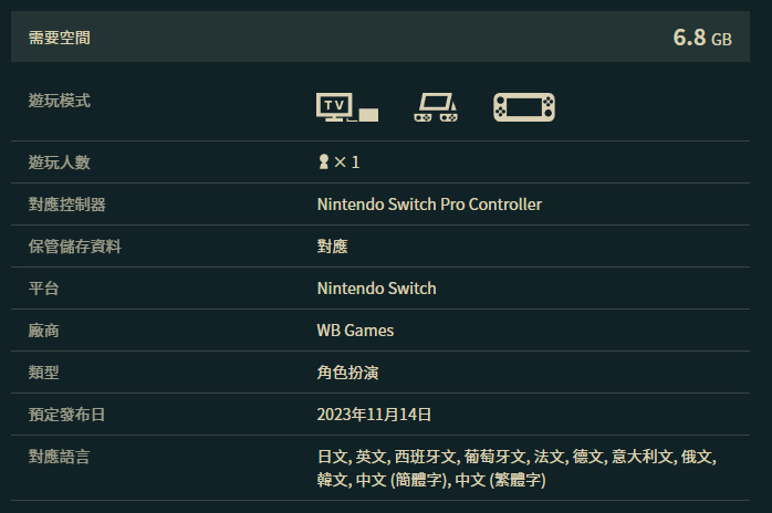 NS版《霍格沃茨之遗》将于下周二(11月14日)正式推出,数字版大小为6.8G。