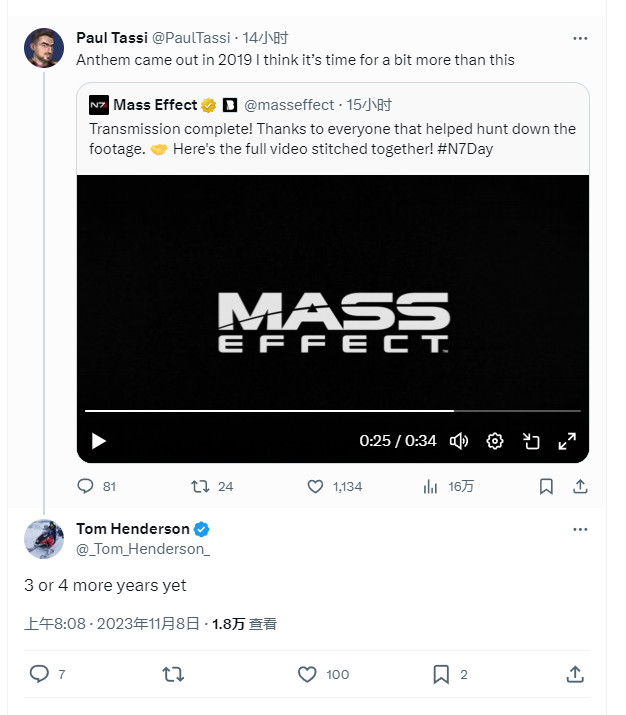 视频发布后,有网友觉得新的《质量效应》似乎要和我们玩家见面了。但情况好像没有那么乐观。据知名舅舅Tom Henderson,新《质量效应》还有很长时间,还要等上3-4年时间。
