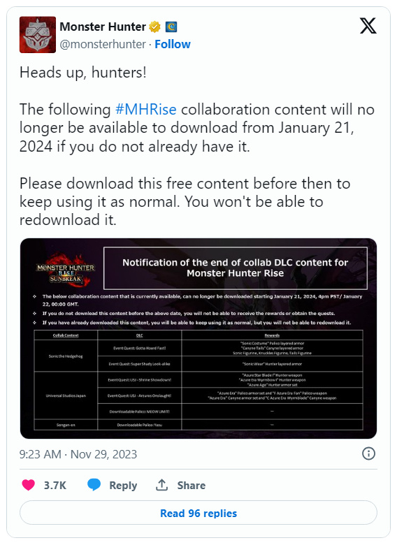 卡普空今天发布推文,宣布明年 1 月下架《怪物猎人:崛起》游戏中的联动 DLC 内容。2024 年 1 月 21 日之后,游戏中将不再提供与刺猬索尼克、日本环球影城和仙岩园的合作内容。