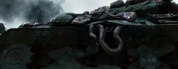 托罗躲过飞机,头顶坦克开过。这里坦克上出现了类似章鱼的生物尸体。但是,其实联系死亡搁浅和历史上多数出现的“不明生物”搁浅事件,与过去人们理解的截然不同,这个其实不是巨型乌贼,而是另一种经常搁浅的生物——鲸鱼,的腐烂尸体或内脏。