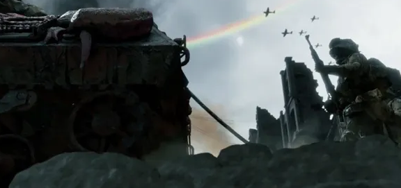 骷髅士兵与坦克,坦克有“线”,骷髅士兵的枪年代有些久远。注意,虽然这个镜头里出现的飞机没有“线”的轨迹,但是在游戏场景里能看到“线”的痕迹。