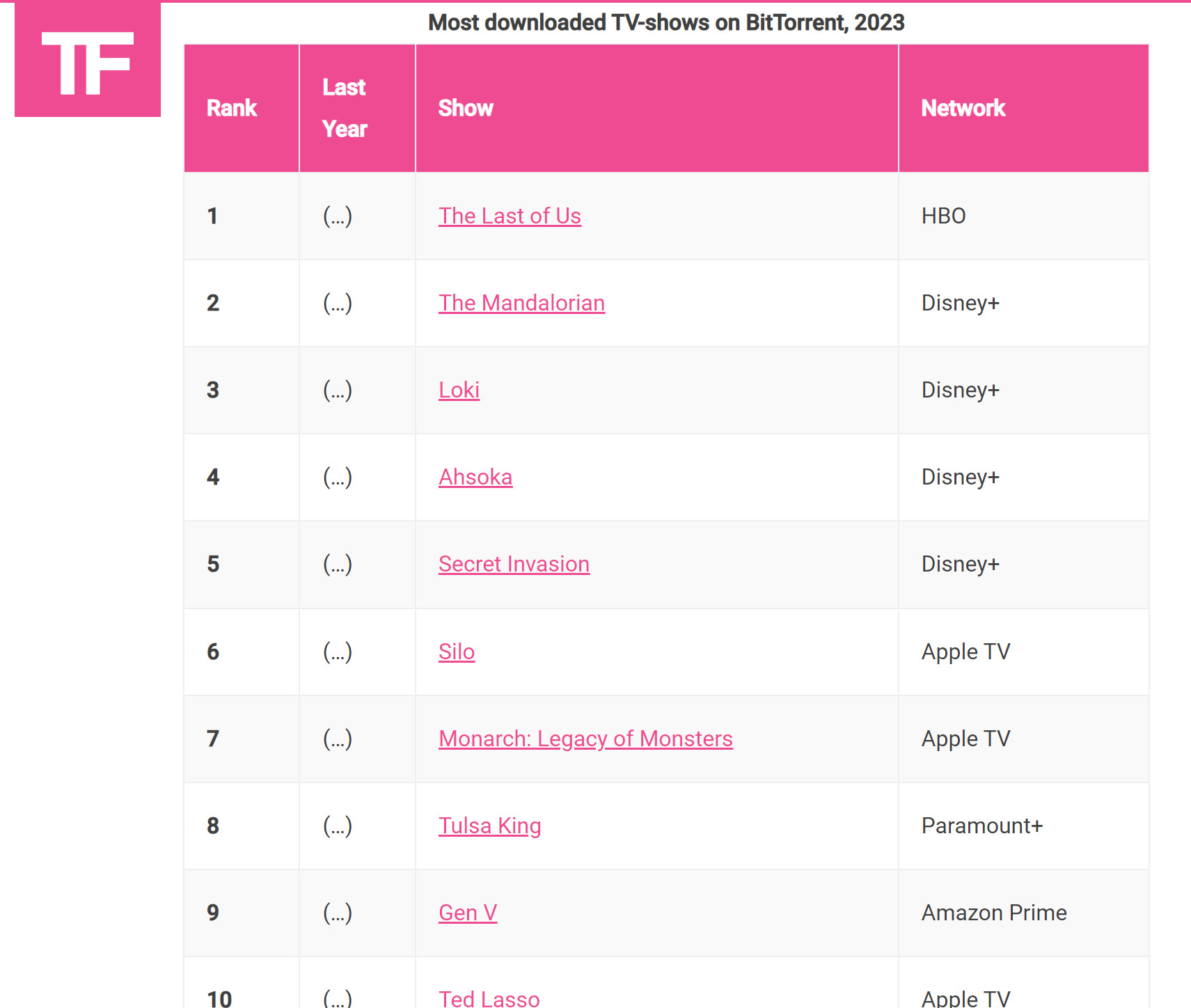 这份榜单最引人注目的地方在于全部来自于视频订阅服务,随着当前流媒体版图的碎片化,看起来很多人更喜欢看盗版,而不是购买另外一个订阅服务。