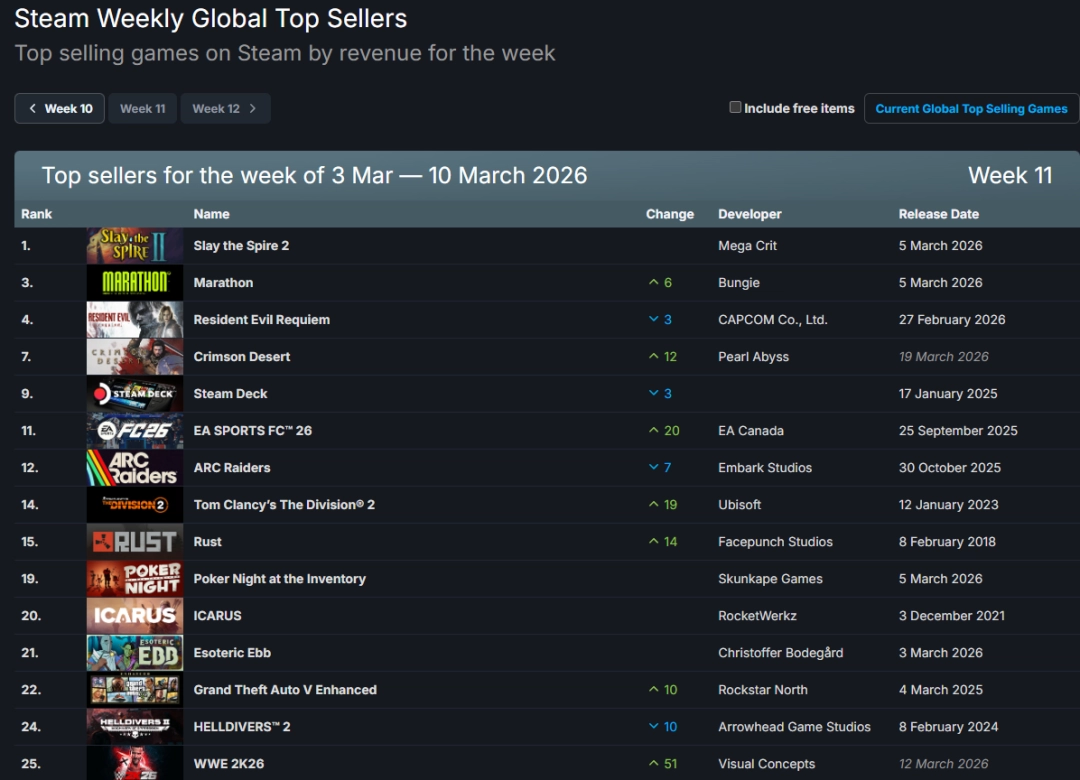 - 《杀戮尖塔2》打败《生化危机9》!登顶Steam周销榜