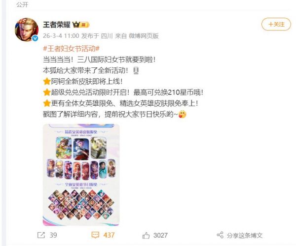 - 王者荣耀官宣妇女节活动:全体女英雄节日限免,多款精选女英雄皮肤限免
