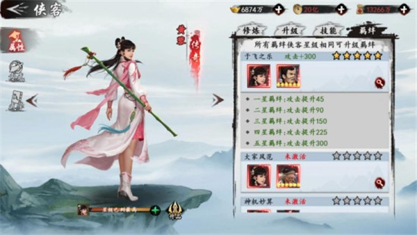 5、品阶的提升除了可以提升战力外,还可以解锁更多的技能,也就意味着更多的输出,因此侠客的培养除了等级提升外,也要着重于品阶提升。