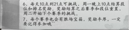 6、每天10点到21点可挑战,周一晚上10点结束段位和排名奖励。奖励结算之后赛季和段位重置,周二开始下个赛季的挑战;