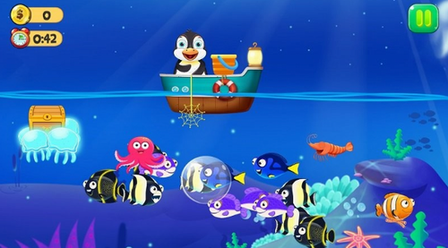 2、简洁轻松的游戏画面,一望无际的大海景色,还有各种不同的鱼类等你收藏。
