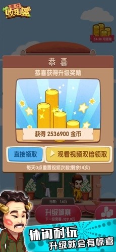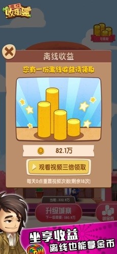 这是一款以收租为主题的搞笑模拟手游,游戏采用卡通式的漫画风格为大家呈现各种收租的诙谐剧情,还会给你提供房租哦~~赚到的房租可以用来升级城寨,招募更多的客人~~快来跟收租婆一起~建造一座独一无二的城寨吧~~~!!!