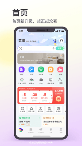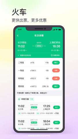 2、火车票:支持在线抢票、在线选座;快速出票,支持邮寄;更多个性化服务,红包优惠!