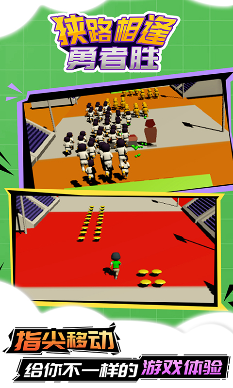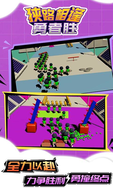狭路相逢勇者胜作为一款充满刺激感竞技类型的手游。狭路相逢勇者胜游戏中,会有许多的用户一起来到这个赛道上面,前面的障碍物也是众多,跑在最前面也不一定能获得胜利,只有到达终点才算胜利,所以不用急着抢第一,看着局势进行安排。