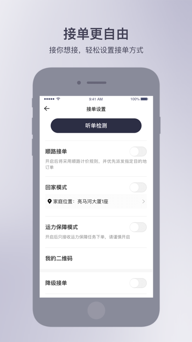 4、自由接单:想接单可以轻松设置接单方式。您可以选择预订订单、机场订单、绑定订单、特价订单绑定等多种模式,还可以设置回家模式,避免回家路上不必要的订单。空驾驶,首汽约车更好保障您的利益。