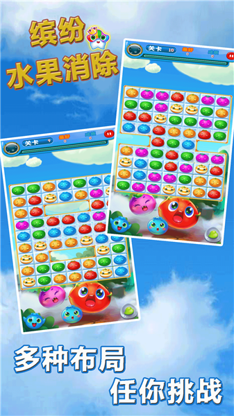 4、缤纷水果消除在这些迷人的淘汰关卡中,每个关卡获得更多分数。