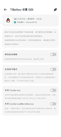 模块有两种工作模式。一是关闭系统自带的QQ、TMHook电源锁“Wakelock”,使其不能影响系统睡眠。这样QQ和TIM就可以在锁屏的情况下进入休眠状态。