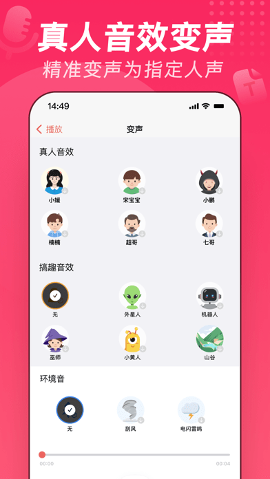 2、趣味录音:多种变声效果,任意切换录音声音。多种场景音效、海量背景音乐添加以及录音降噪功能,让音频不再单调,提高录音质量,让录音变得有趣。