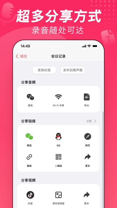 3、轻松分享:微信、QQ、网页、二维码、链接等多种分享方式随时随地一键分享录音。