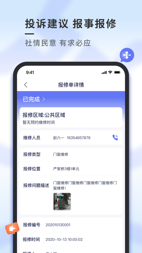 2、用户可以通过南陵新物业app在线进行报修、投诉、咨询等,非常方便。同时,用户可以随时查看物业服务的进度和处理结果,真正实现“零距离”服务;