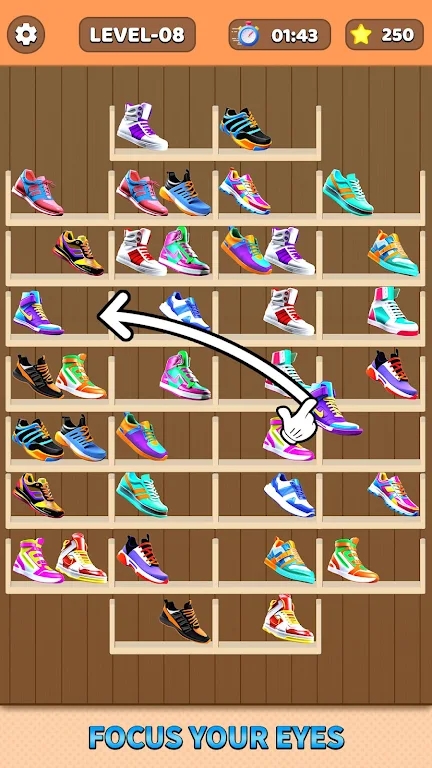 1、操作简单,玩法易于上手。点击不同的鞋子图案,对它们进行分类;
