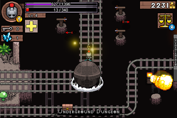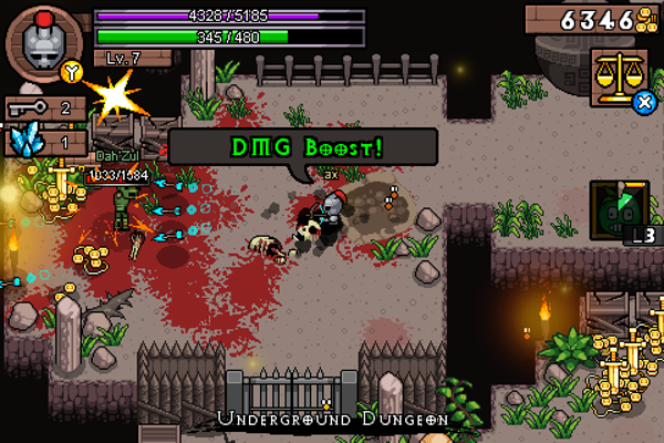 在城镇中有一个蓝色的椭圆,通过这个椭圆的魔法门我们可以选择想要进入的战斗区域。接着就可以开始激动人心的战斗了。来到一个场景之后,每一个回合都有一定数量的怪物出现。我们需要控制角色不断的在场景中击败怪物和破坏场景中的箱子来获得奖励,有时候我们会捡到装备,有时候我们会捡到金币。通过这样不断的战斗获得奖励让自己的等级技能提升,获得更好的装备等等。