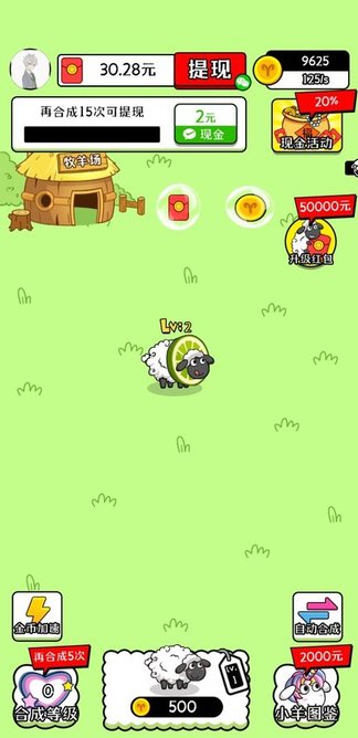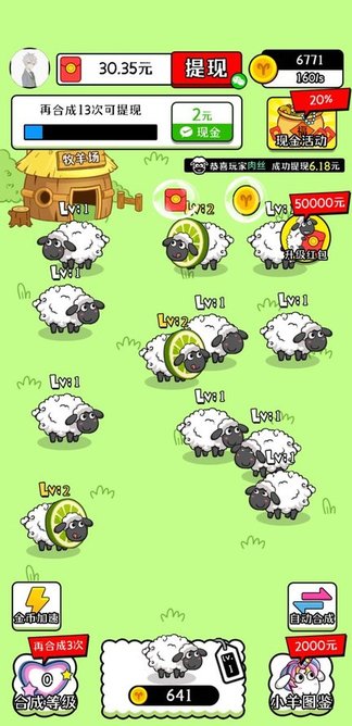 将两只相同类型相同等级的小羊合成更高阶的等级,就有机会领取红包。