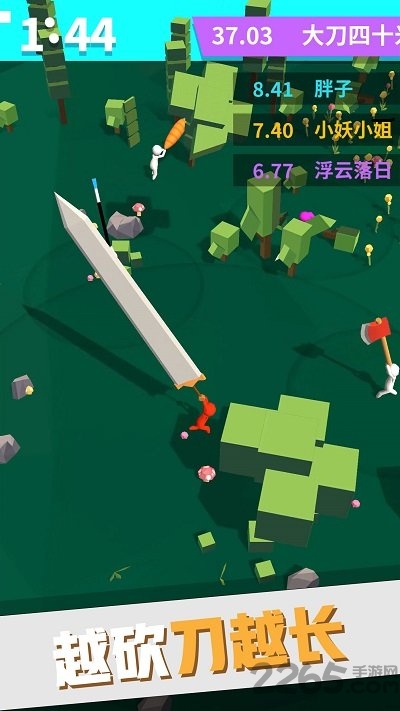 1.手游规则很简单,挥砍是自动进行的,停下不动可以进入防御状态。砍中人或者其他物件树木、石头等都可以增加刀的长度,但是刀越长挥动起来越费力气,动作越慢,容易被攻击。