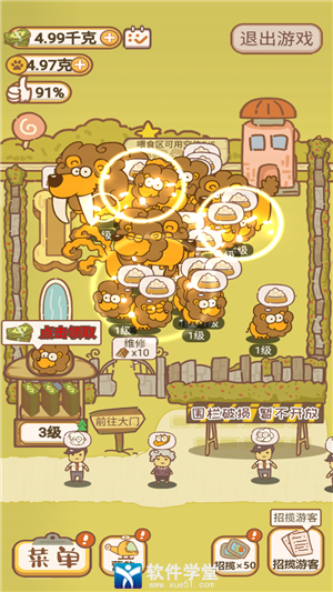 1、游戏者将扮演一名动物园园长,需要不断完成任务升级拓展你的动物园,2、开启更多的珍惜动物,一边快乐养殖一边吸引更多的顾客,还可以增加游乐设施3、当园内开始饲养动物,就可以售卖门票,广告宣传,招揽更多的游客