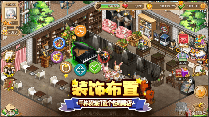 手游中游戏者可以自由装饰你的咖啡店,升级店铺的魅力值,让你的奇思妙想在这千种装饰之中焕发活力。