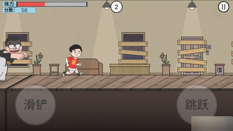 4、点击开始即可开始游戏,左边是滑铲右边是跳跃,玩家需要操控人物躲避杰哥。