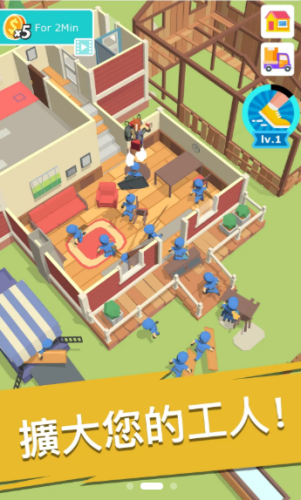 2.工人只要开始工作就可以积累资金。消耗资金可以升级卡车、工人数量、效率等,让您的装修之旅快速腾飞