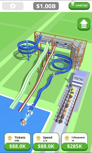 轻松愉快的音乐,卡通的手游画面,很休闲的减压放置经营机制,轻松有趣的经营玩法等着你来,建设水上乐园。
