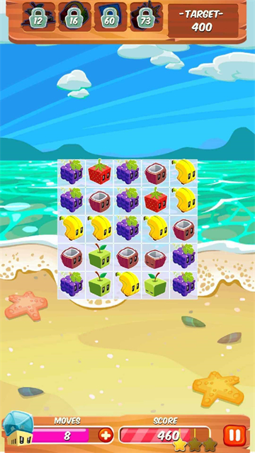 果汁块是款休闲益智类型的游戏,在游戏当中需要玩家不断的将方块水果来进行消除,而且能让玩家在游戏中挑战不同的关卡,既有着欢乐的氛围,又有着多种的果汁元素,不必担心会有混淆的感觉,色彩非常的鲜艳,而且不同的水果采用的是不同的元素。