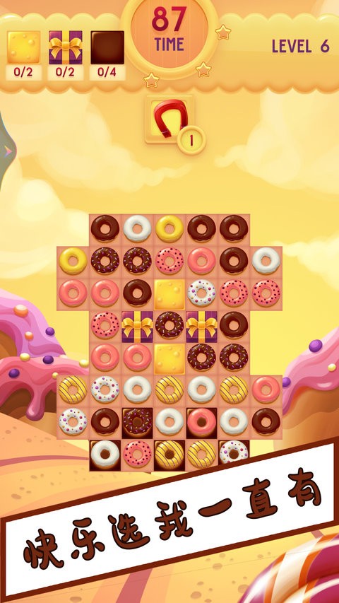 1、玩家需要点击或滑动屏幕,选择相邻的相同类型甜甜圈,形成消除,获得分数;