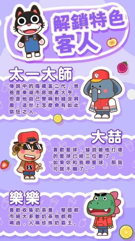游戏用温暖治愈的奶茶店模拟经营游戏,带领您进入梦幻般的奶茶世界。在这里,你将变身奶茶店主,用创造力和热情调整所有甜蜜的杯子,打造独特的奶茶帝国。