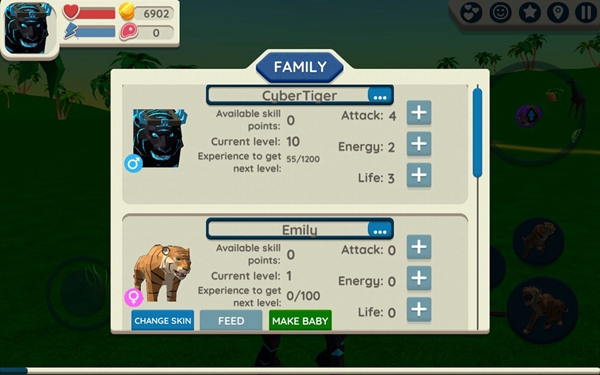 获得经验击败其他动物和提高你的健康水平,攻击伤害,甚至开启新虎皮毛!