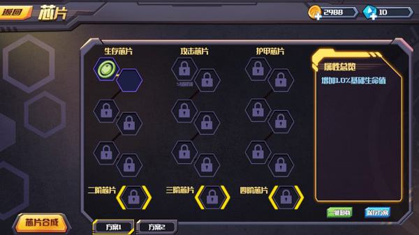 芯片的设计简直就和moba类游戏的符文系统没什么太大的区别,都是会提供一些属性值的加成,玩家可以将芯片以花费金币的模式把三个融合成一个更高级的芯片,并且芯片还分三个类别