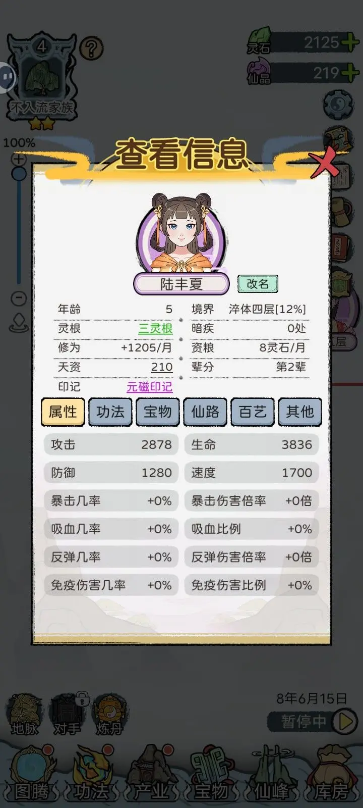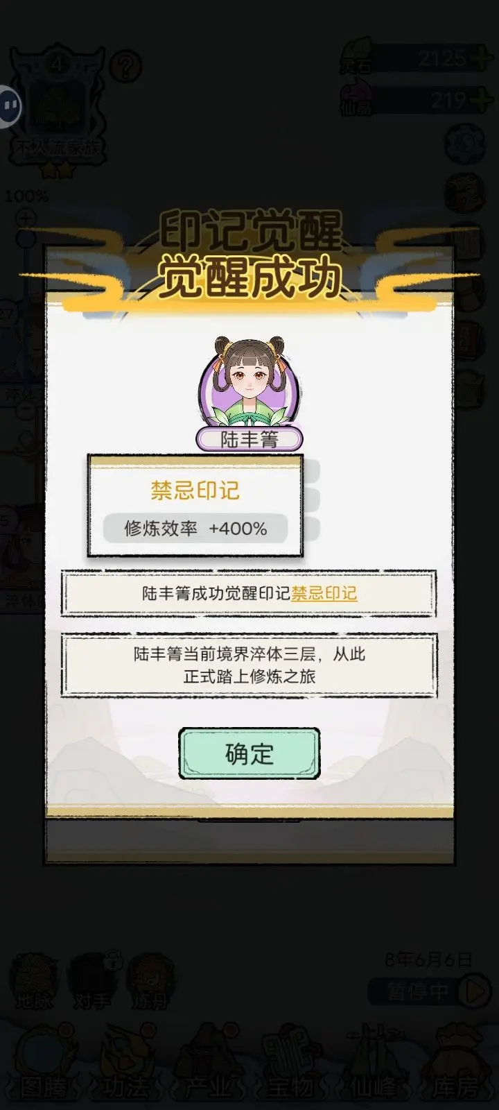 9、每月都会自动增加修为,需要消耗灵石,当灵石不足时就会暂停修为,玩家需要合理使用灵石。