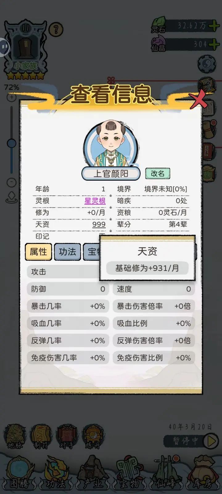 2. 建议属性值也要传承一部分给孩子,这个境界提升的属性值太少了,还是要靠功法,这个很不合理,我一个淬体的百年老怪物只要一开始挂着功法升级,那就是无敌,敌人什么境界都直接秒。这会让游戏往下传承的意义形同虚设。