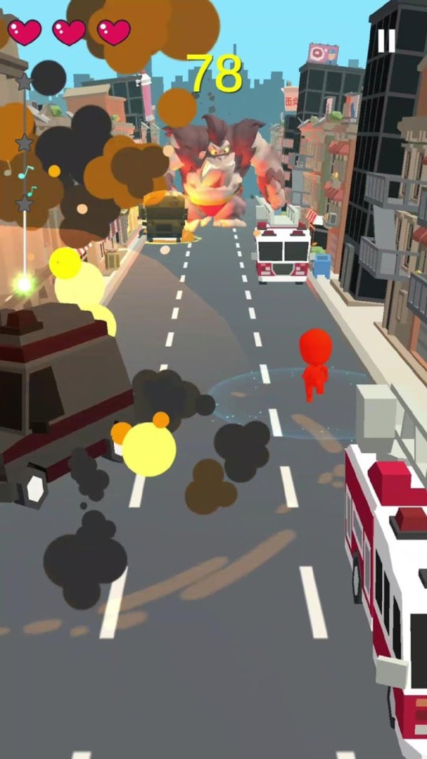 节奏逃生是一款很有韵律的冒险跑酷类手游,城市间的宁静被突然降临的大猩猩所打破,它在这个城市中开始了无尽的破坏,而玩家将会控制角色不断对突如其来的障碍物进行躲避。