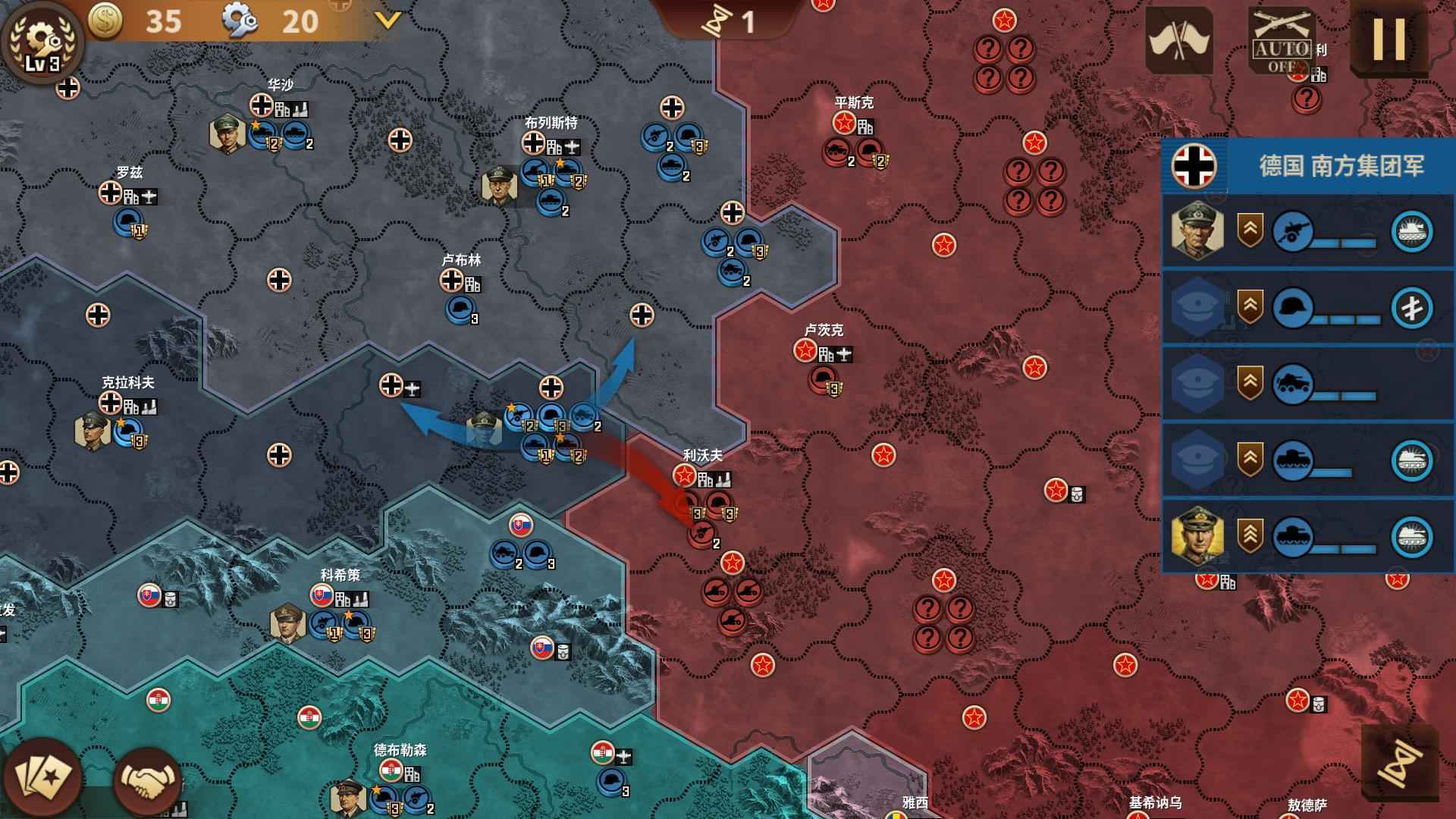 部署集团军部队,每个国家有其专属科技卡牌,通过科技卡牌加速征服世界的进程。