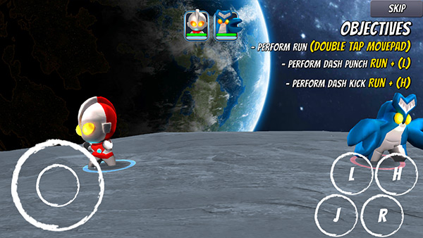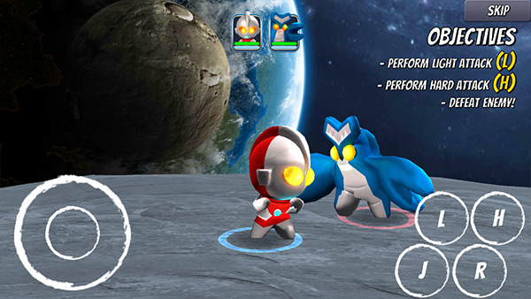2、“I”按钮可控制奥特曼跳跃到空中对怪兽造成伤害;