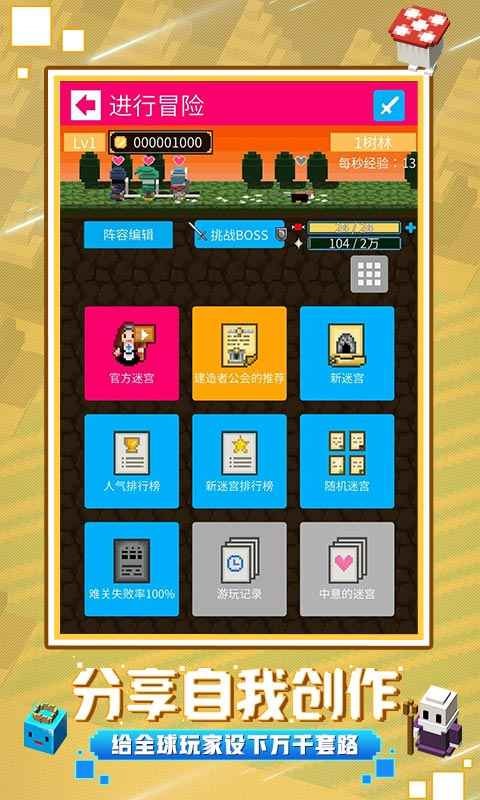 非常好玩精彩的建造迷宫游戏。在游戏中,玩家将成为勇者并在地牢中探索。迷宫中有很多宝藏,玩家可以用你丰富的想象力和创造力,搭建属于你的迷宫,还可以作为挑战者,进入破解自己的或者别人的迷宫,不知你是否能出来呢?