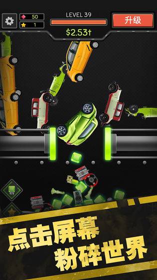 游戏玩法还是跟1差不多,很简单,甚至都不用经过新人教程都能玩懂(或许是我太聪明了吧)游戏主要还是以粉碎车辆为目标而赚钱钞票,再用钞票购买车辆和升级粉碎设备。