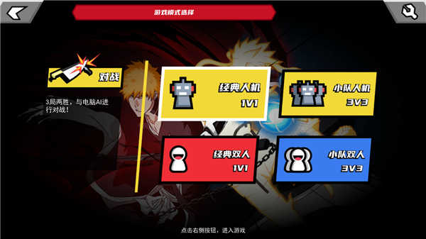 1.打开真死神VS火影绊游戏,进入游戏模式选择,可选择故事模式、闯关模式、对战模式、训练模式;