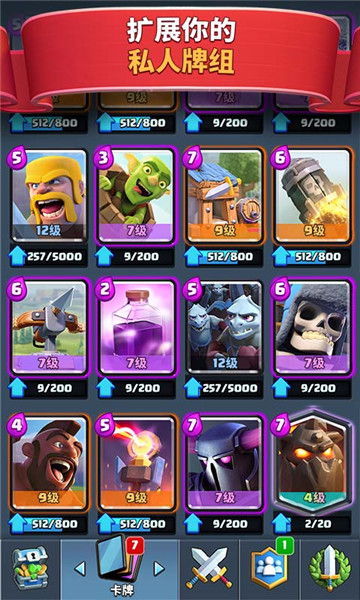 搭配出您的终极出战卡组,一举击败对手;在各个级别的竞技场上挑战其他玩家,一步步登上巅峰;与全世界的玩家进行实时对战,击败他们,赢取奖杯;解锁宝箱以获得强大的新卡牌,并升级你现有的卡牌;友谊赛模式,向您的部落成员和好友发起挑战;观看巅峰对决视频,学习顶级玩家的各种对战策略;摧毁对方皇家塔赢得皇冠,获取充满惊喜的皇冠宝箱;收集皇室战争家族成员和您熟悉的部落冲突军队、法术和防御建筑等卡牌,打造和升级您的卡组;建立或加入一个部落,与成员相互捐赠卡牌,打造属于自己独一无二的战斗联盟。