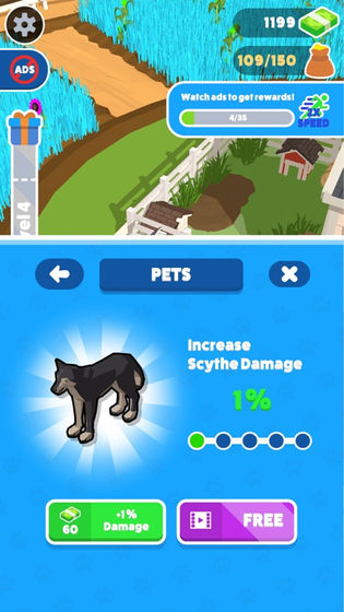 1、使用强大的镰刀进行收割,随着收益的增长,玩家可以解锁更高效的镰刀,提升收割速度;